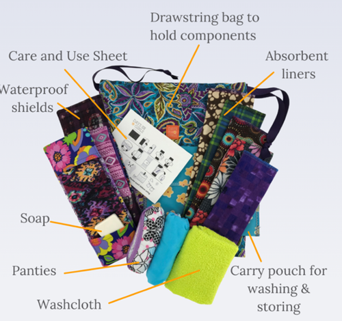 Each bag contains 2 shields, 8 pads, and a few purchased items (a bar of soap in a wet bag, 3 pairs of underpants, a washcloth).