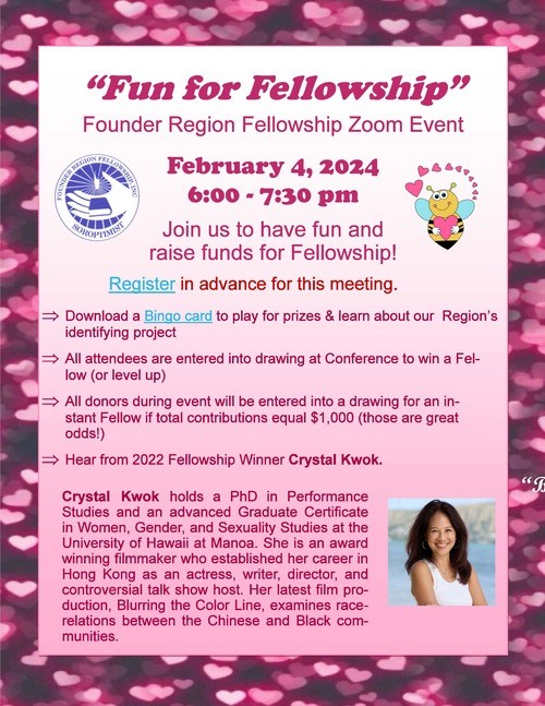 Remember that February is “Fun for Fellowship” month. Be sure to sign up and Zoom in on Sunday, February 4th for a great time as we raise funds for Fellowship. We will hear from 2022 recipient Crystal Kwok and have some fun playing Fellowship Bingo.