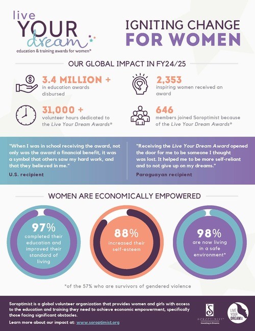 Every year, Soroptimist distributes more than $2 million in education grants to about 1,500 women all over the world. Over half of our Live Your Dream Awards recipients are survivors of domestic violence, trafficking or sexual assault. Nearly all of the women and families we serve have overcome enormous obstacles including poverty, teen pregnancy, and drug or alcohol addiction. Live Your Dream Awards recipients may use the cash award to offset any costs associated with their efforts to attain higher education, such as books, childcare, tuition and transportation.