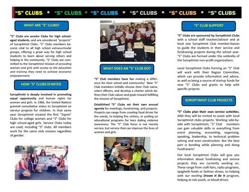 "S" Clubs are service clubs for high school students in our communities. They are considered "projects" of Soroptimist clubs. "S" clubs are a vital part of the high school extracurricular groups and are a great way for high school students to learn about serving others and helping in the community. The "S" clubs in Founder Region focus on helping women and girls improve their lives through programs leading to social and economic empowerment.